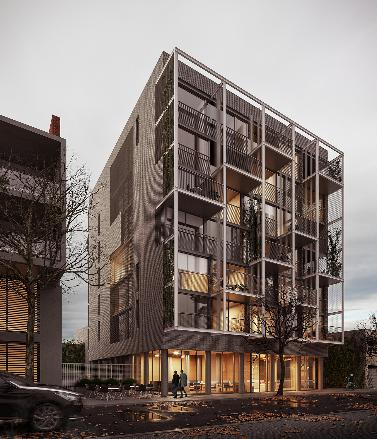 El diseño integral del edificio consolida un lenguaje arquitectónico contemporáneo que mezcla materialidades en búsqueda de la complejidad formal de las cuatro fachadas del edificio exento y dialoga con la estética de las casas.